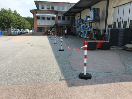 - Paal- en kettingbarrièresysteem is ideaal voor tijdelijke barrières, flexibele grenzen, wachtrijbeheer, of om veilige werkzones of gebieden te creëren