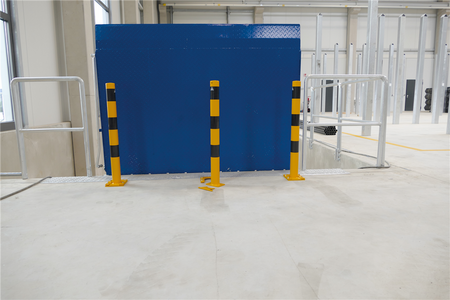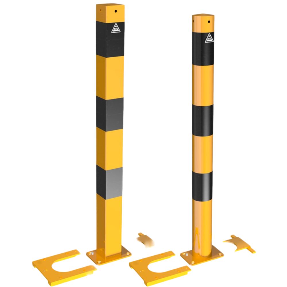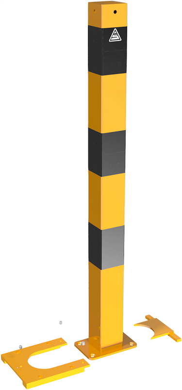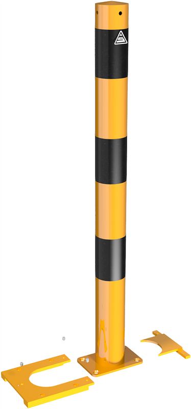 Deze gele paal met zwarte strepen markeert gevarenzones en beperkt gebieden die je vrij wilt houden van verkeer. De paal is aan de voorkant bevestigd aan de vaste grondplaat met een T-vormig stuk. Hij kan echter gemakkelijk worden vervangen indien nodig, aangezien alleen de grondplaat permanent aan de grond is bevestigd, niet de paal zelf.