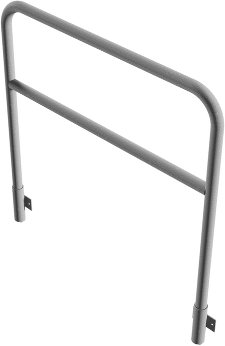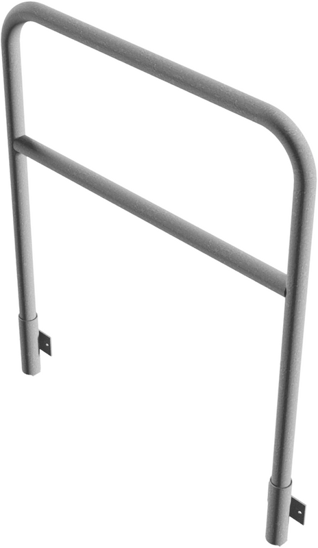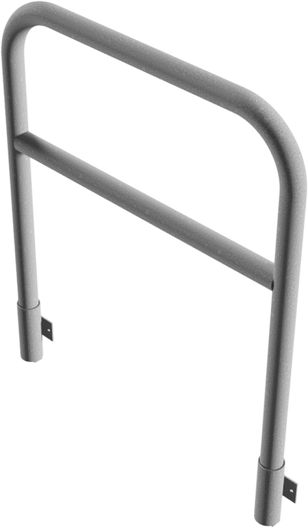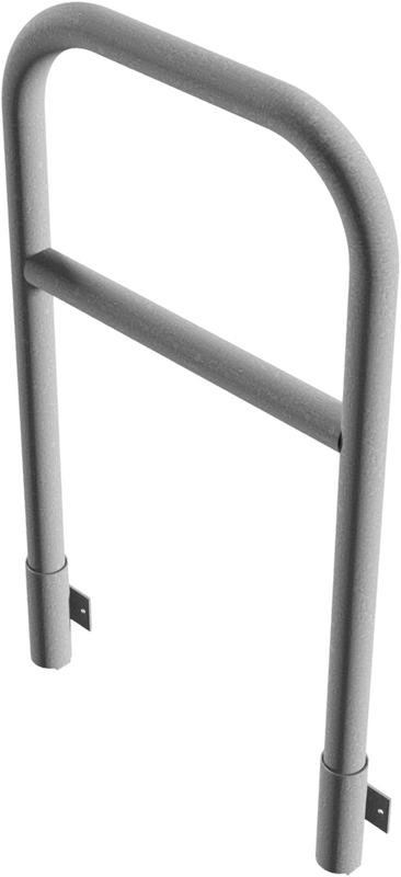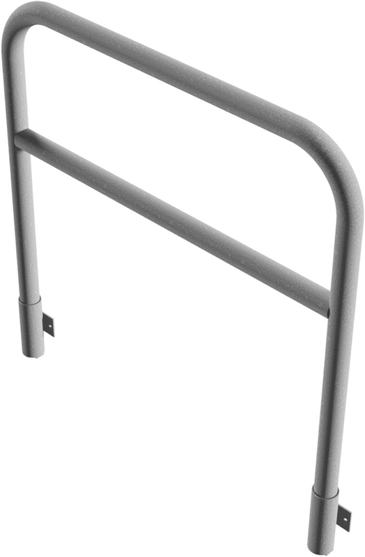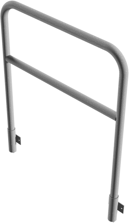 Beschermbeugel met kwartgebogen stang ronde stalen buis Ø 48,3 x 2,5 mm voor wandmontage, incl. 2 buisvoeten type 443.15W voor insteken, verwijderbaar, zonder vergrendelingsmechanisme.