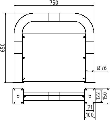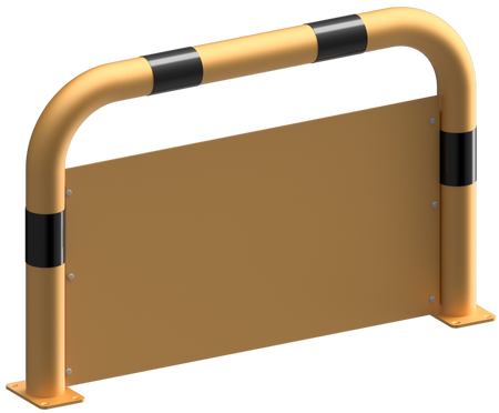 Beschermingsbeugels, stalen buis Ø 76 mm voor verankering, met voetplaten 100 x 150 mm, thermisch verzinkt, poedergecoat geel, met zwarte waarschuwingsstrepen.