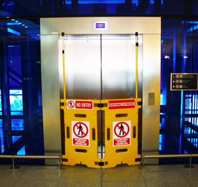 ElevatorGard is een hoogwaardige, opvouwbare liftonderhoudsveiligheidsbarrière ontworpen voor gebruik tijdens liftstoringen of onderhoudswerkzaamheden in een gebouw met meerdere verdiepingen. Elke panelenset bevat (2) panelen, elk met een gewicht van 4,5 kg. Elk paneel is 660 mm breed en 1100 mm hoog. Elke modulaire eenheid kan worden gekoppeld aan een andere eenheid om grotere blokkades te vormen die voldoen aan de gebruikersvereisten. Elke barrière bevat niet-geleidende telescopische stangen die binnenin zijn opgeslagen en zich tot 2,2 m boven het afgewerkte vloerniveau uitstrekken. Gemaakt van lichtgewicht en duurzaam polyethyleen plastic, voldoet dit panelenbarrièresysteem aan de gezondheids- en veiligheidsvoorschriften BS7255:2011 en aanbeveling PM26.
