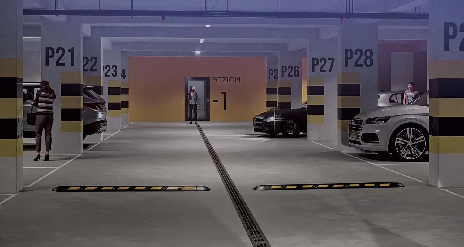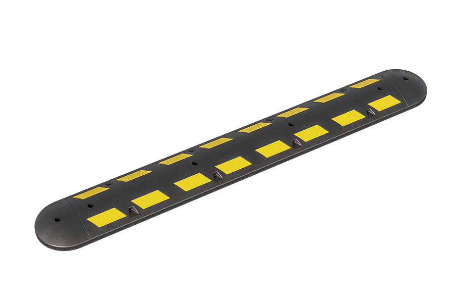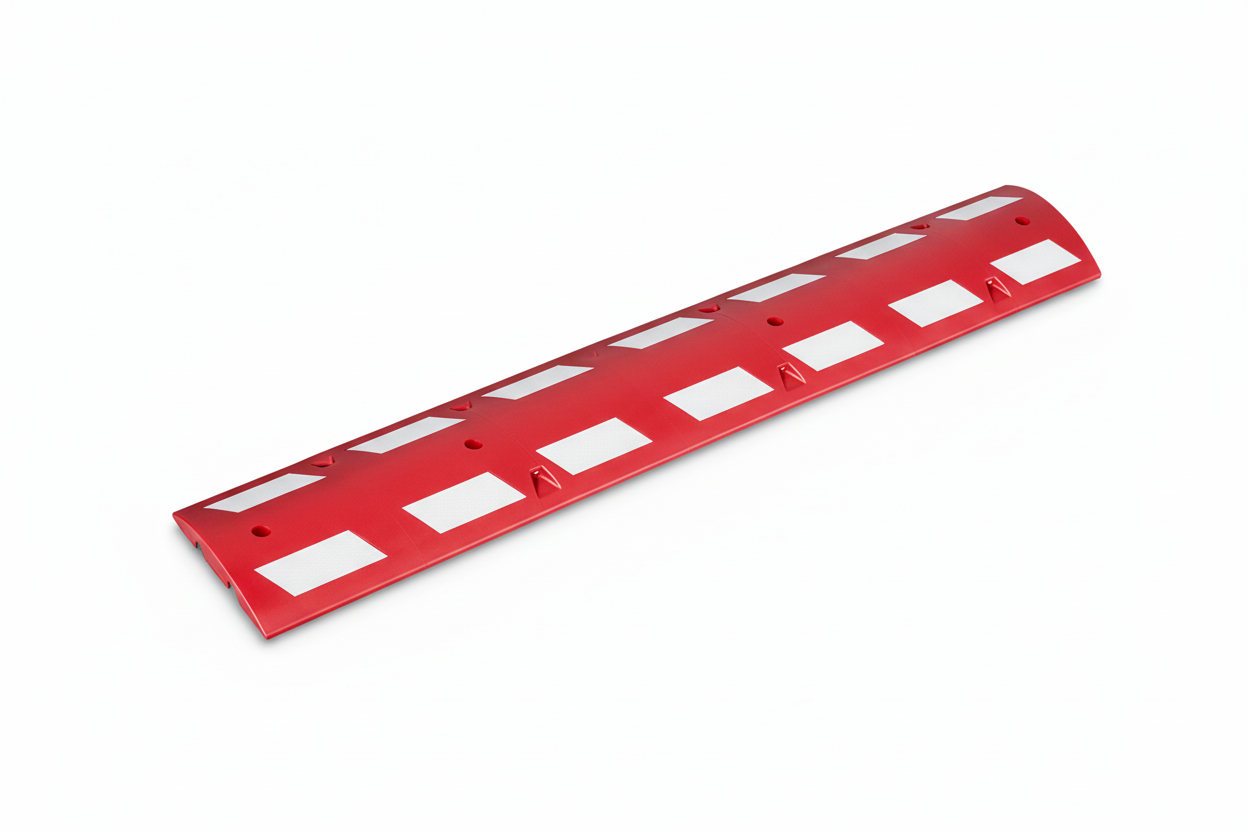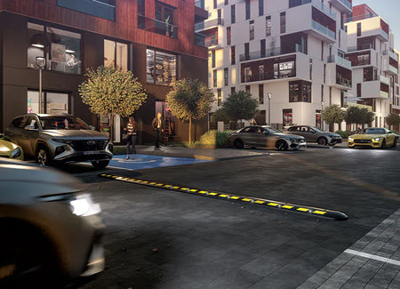Zwaar uitgevoerde modulaire rubberen verkeersdrempelsysteem ontworpen voor verkeersremming in woonwijken, parkeerterreinen, bedrijfsterreinen en schoolzones.