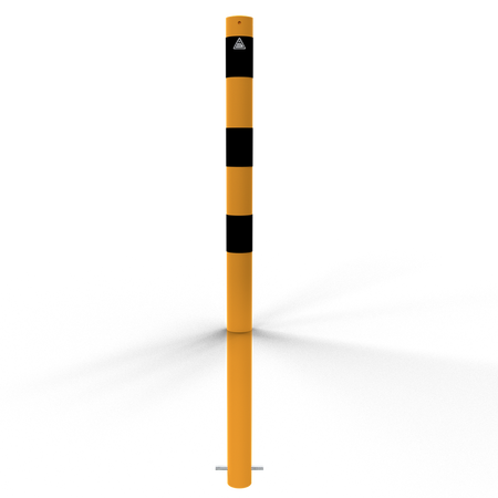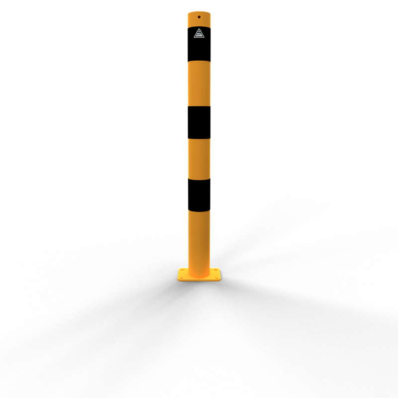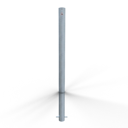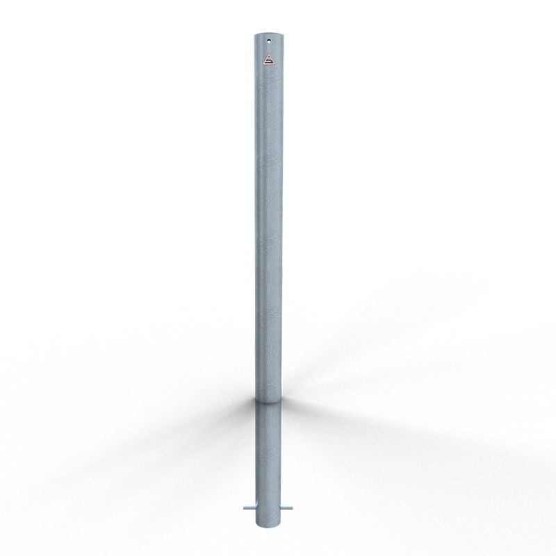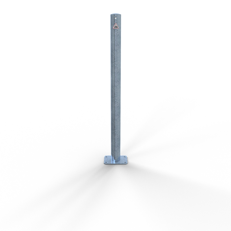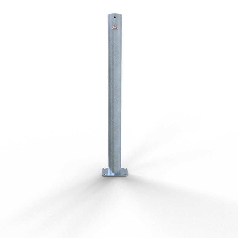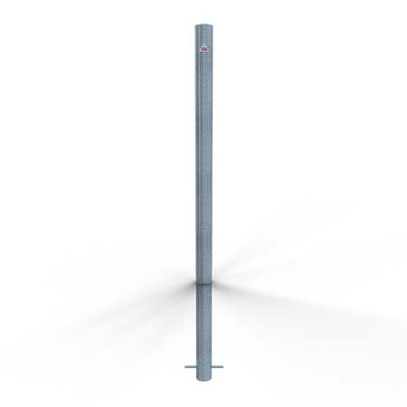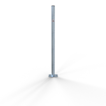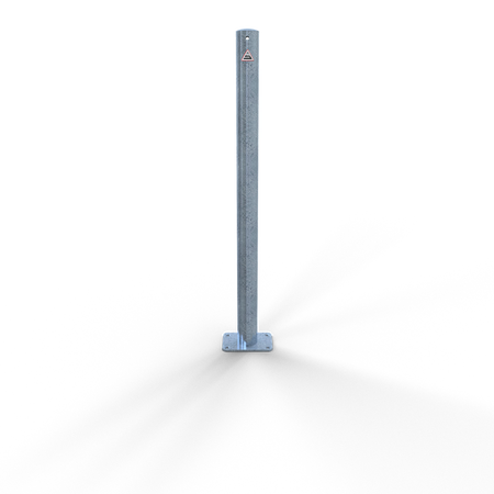 - Stalen barrièrepaal kan in beton worden gegoten met behulp van een grondanker of met pluggen aan de grond worden bevestigd met een voetplaat