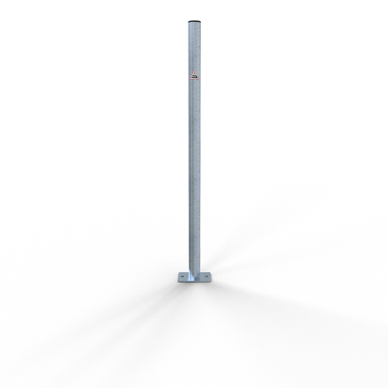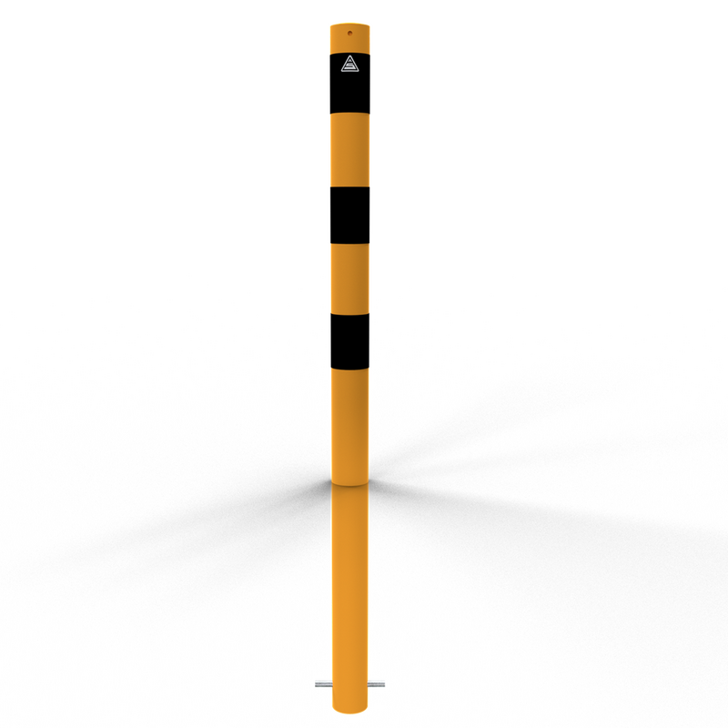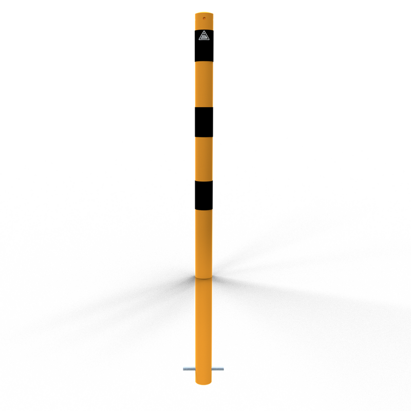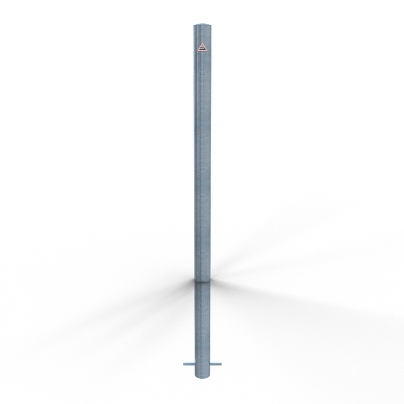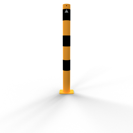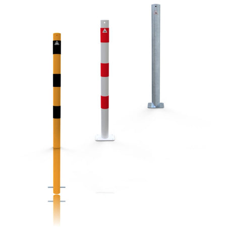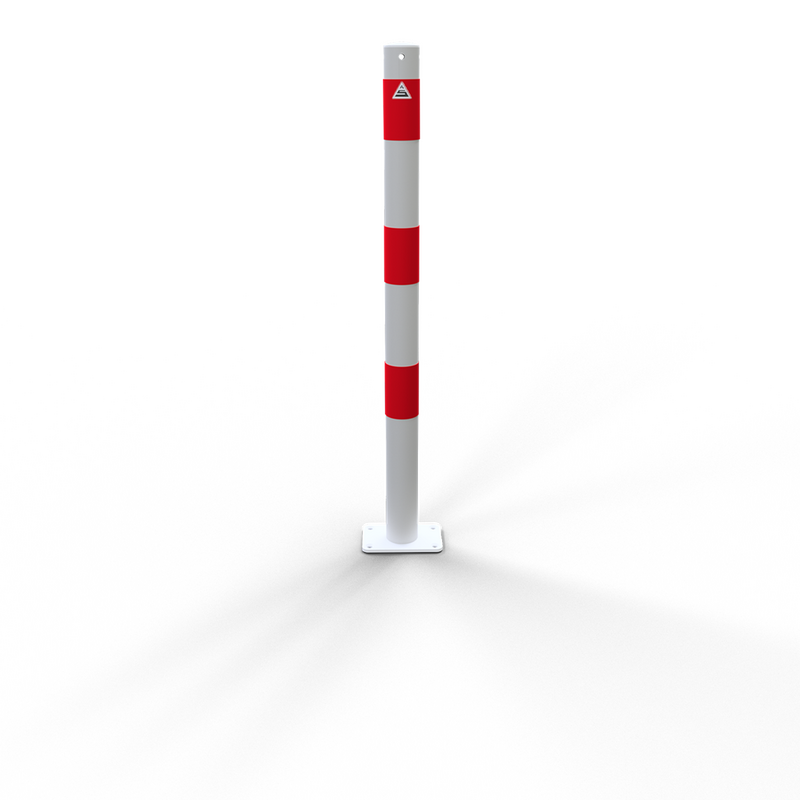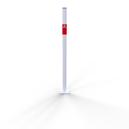 - Stalen barrièrepaal kan in beton worden gegoten met behulp van een grondanker of met pluggen aan de grond worden bevestigd met een voetplaat