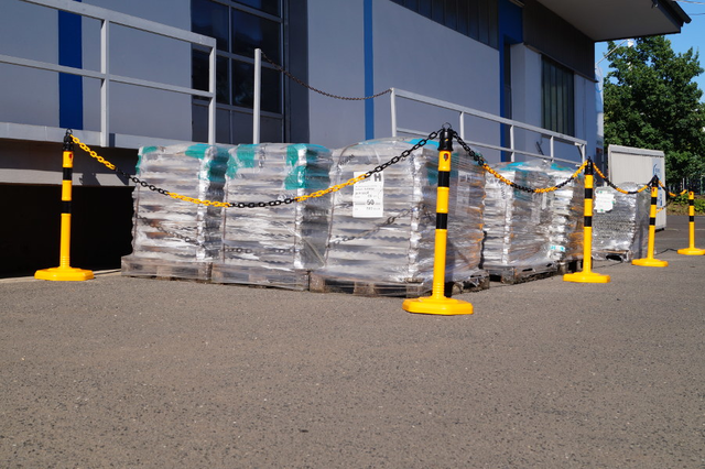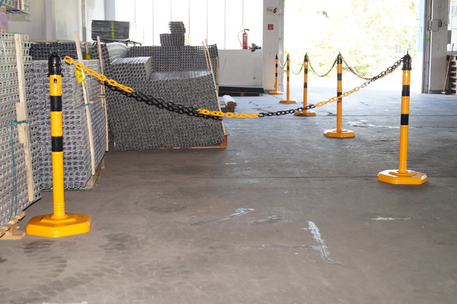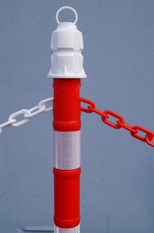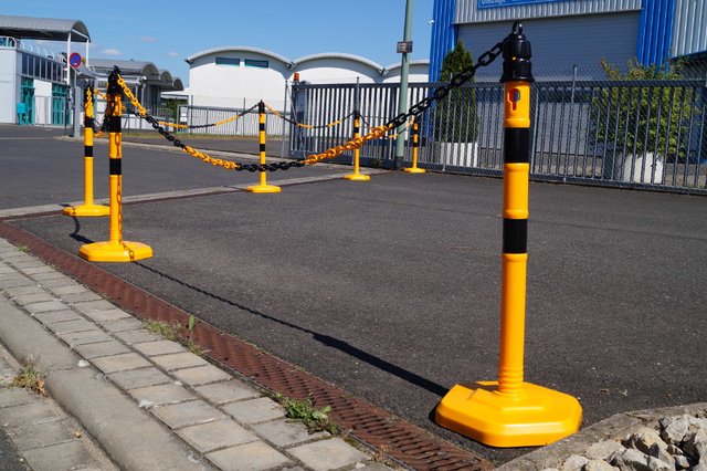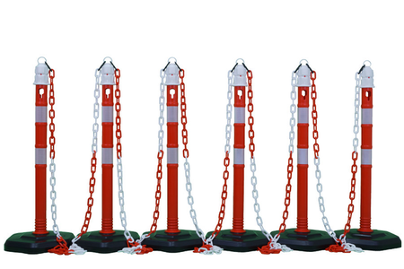 De set van 6 MultiMax Post & Chain Barriers met 15m plastic ketting inbegrepen is een ideale toevoeging aan elke drukke omgeving met veel voertuig- en voetgangersverkeer. De 1000mm hoge paaltjes met ø63 mm zijn ontworpen met een oogbout met M 36 voor het verbinden van kettingen en linten. De bovenkant van de paal is voorzien van kettingogen voor het bevestigen van de kettingen. De meegeleverde kettingen helpen om verboden gebieden af te sluiten of om verkeer te ontmoedigen bij in- of uitgangen van een specifiek gebied. Vaak gebruikt bij parkeerplaatsen, scholen, magazijnen, deze kettingpaalbarriereset is verkrijgbaar in een rood/wit of geel/zwart kleurenschema met of zonder de zeer zichtbare, reflecterende strepen langs de lengte van de paal.