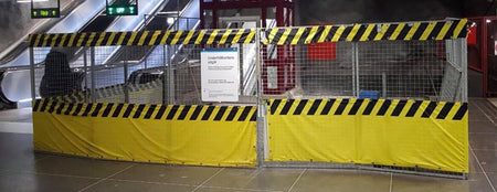 Waarschuwingshoes met hoge zichtbaarheid in geel en zwart, ontworpen om op standaard tijdelijke hekpanelen (2m x 3,5m) te passen. Ideaal voor het verbeteren van de veiligheid en zichtbaarheid op bouwplaatsen en andere beperkte gebieden.