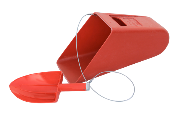 Zowel de emmer als de schep zijn gemaakt van vorstbestendig plastic en zijn voorzien van versterkte handgrepen. De schep is met een 1 m lange met plastic beklede staaldraad aan de emmer bevestigd, zodat deze altijd binnen handbereik is.